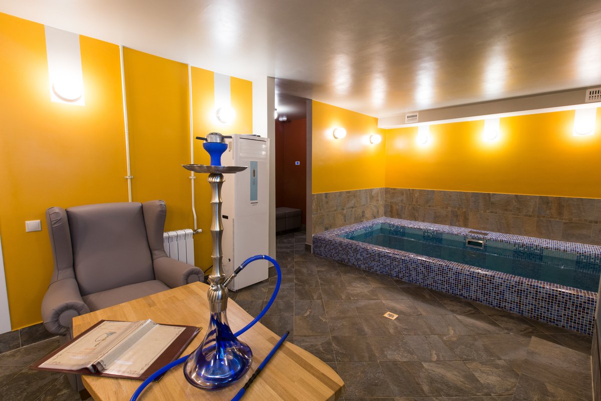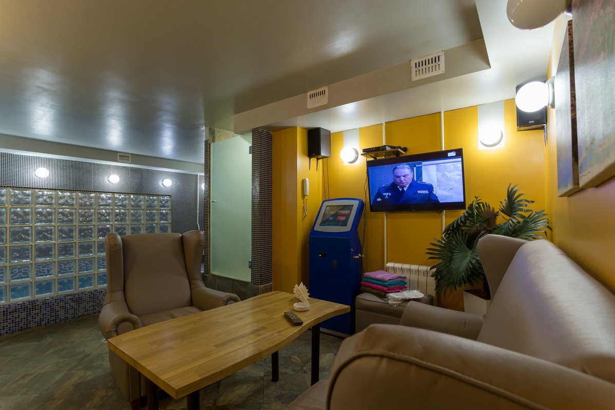 Мы с друзьями были в желтом зале. Этот зал небольшой и для 3-4 человек отлично подойдет. К нашему приходу было уже все подготовлено, парилка прогрета. Парилка вообще отличная, горячая, удобная и вместительная. Здесь 2 человека могут спокойно лечь на верхней полке и не мешать друг другу. Парилка, зал и бассейн - все очень компактно расположено. Хотелось, правда, выбежать из парилки и прыгнуть в бассейн с разбегу, но в него можно было только спуститься по ступенькам. Администратор нам предусмотрительно предложил все, что нужно было для отдыха. В прошлом году я был здесь в зеленом зале, который побольше этого. Тоже отличное место.